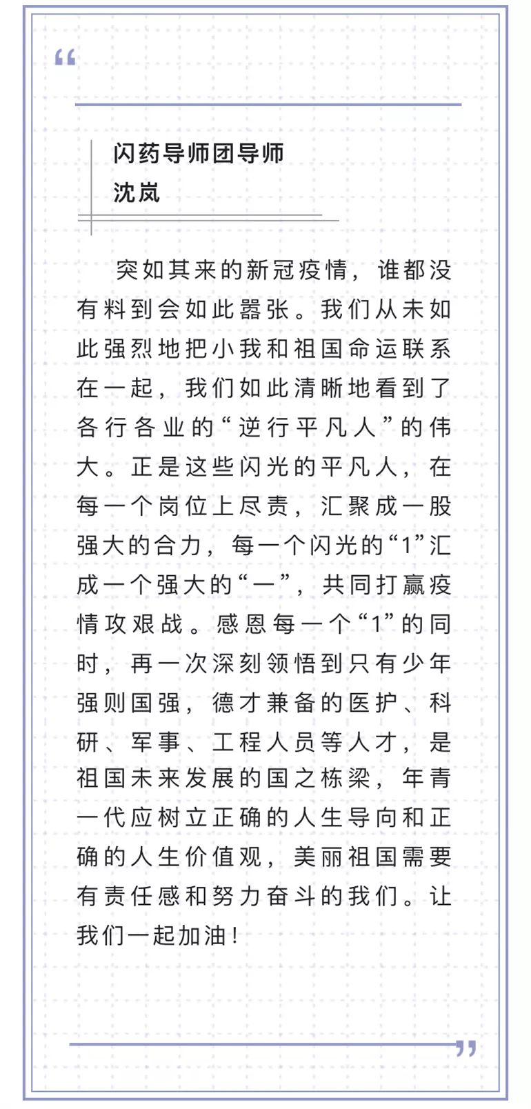 面对这场突如其来的战“疫”,大学生们没有足够的思想和心理准备,调整心态、积极应对才是学生工作队伍要解决的根本问题。导师团的导师们再一次发挥了强大的人格魅力和卓越的影响力,他们将自己的智慧、经验、思考和感悟通过一段段文字,汇聚成一股强大的力量,鼓舞激励杏林学子练就过硬本领、助力健康中国。如致远导师团团长陶建生教授提到:“相信我们的党、我们的国家、我们的人民完全有信心有能力战胜疫情。在疫情防控阻击战中,没有旁观者,我们每一个老师和同学都是战士、都在战斗。”扬帆导师团团长李医明教授提到:“作为新时代的药学生,是否更能感到专业学习的重要性,学好专业知识、服务他人、服务社会的重要意义。”最让人感动的是作为蒲公英导师团团长的林国强院士,不顾70高龄和工作繁忙,主动要求为大学生寄语,并亲自为学生写就一份情真意切的告学子书,信中提到:“武汉疫情,牵动人心之余,却让人愈发坚信;阴霾之下,大爱始终熠熠生辉。在不久的将来,你们将是中流砥柱,守护生命、健康中国的重任将落在你们的身上。”院士和导师们的殷切嘱托给大学生注入强大的动力。他们从身边的榜样身上感受到使命和责任、智慧和力量。