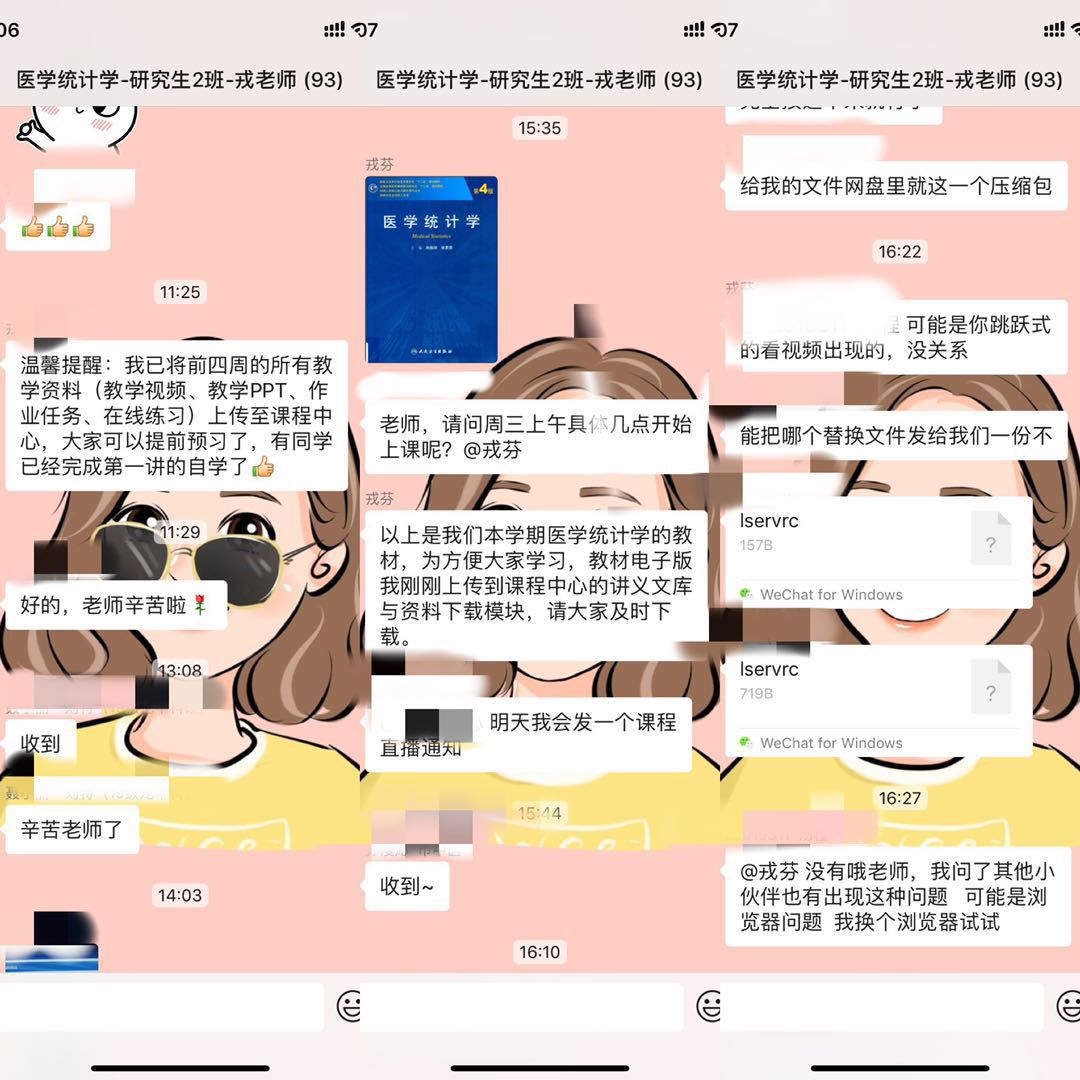 第一次使用慕课在线直播,结合课后答疑来上课!心里很没底,所以我做了很多准备工作,课后给同学布置了作业,同学们也在群里积极参与讨论,我都一一进行了耐心解答。虽然是“第一次”,我也深刻体会到,课前准备十分重要,各种资料和设备调试要充分,课堂上心里才不慌乱!在线学习模式形式新颖,学生可根据自己的情况调整学习节奏,比如不大明白的,课后可以观看回放。但对我也是一个巨大的挑战,尤其是习惯了传统教学模式,面授课可以看到学生,现在我们关心的是:学生是否完成了视频学习?如何保证学生的学习效果?如何监测学生的学习进度?后续的课程中我会根据学生学习情况做些调整,比如是否要开展在线视频直播?直播的时间是否需要延长?总之,在这段特殊的时期,要保证学生的学习效果,保证每个学生不掉队!让我们共克时艰,努力学好医学统计学这门课!