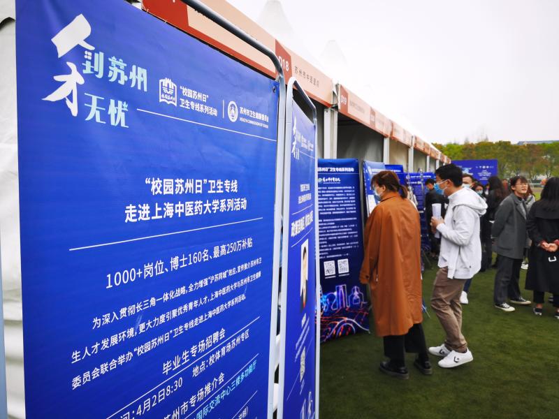 招聘现场,在“校园苏州日”卫生专线——走进上海中医药大学系列活动的“易拉宝”上,“1000+岗位”“博士160
