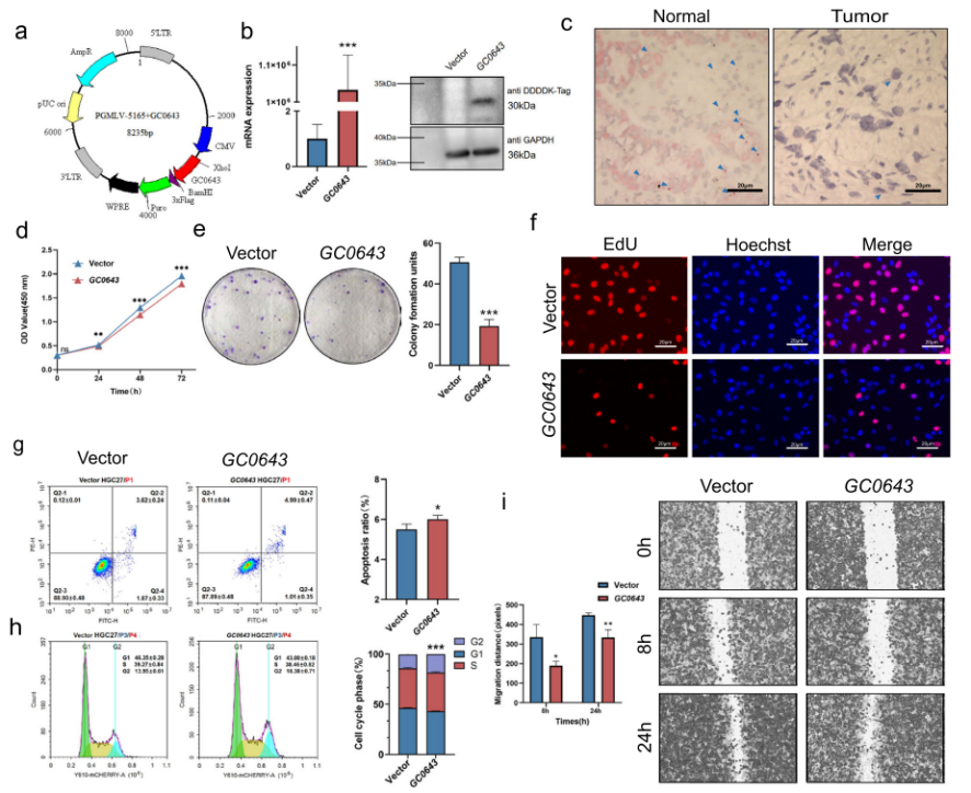 在来自亚洲患者的胃癌细胞系HGC27中加入GC0643真核表达载体后,研究团队在mRNA和蛋白质水平上检测到了GC0643的基因表达(图4)。GC0643基因的过表达显著抑制了细胞生长和集落形成。在GC0643过表达的癌细胞中,淋巴细胞活化和解毒通路被上调;伤口愈合、细胞因子介导的信号传导和细胞分裂被下调。此外,与对照组相比,GC0643过表达显著抑制了细胞迁移,shRNA在敲低GC0643基因后,细胞迁移抑制明显逆转。
