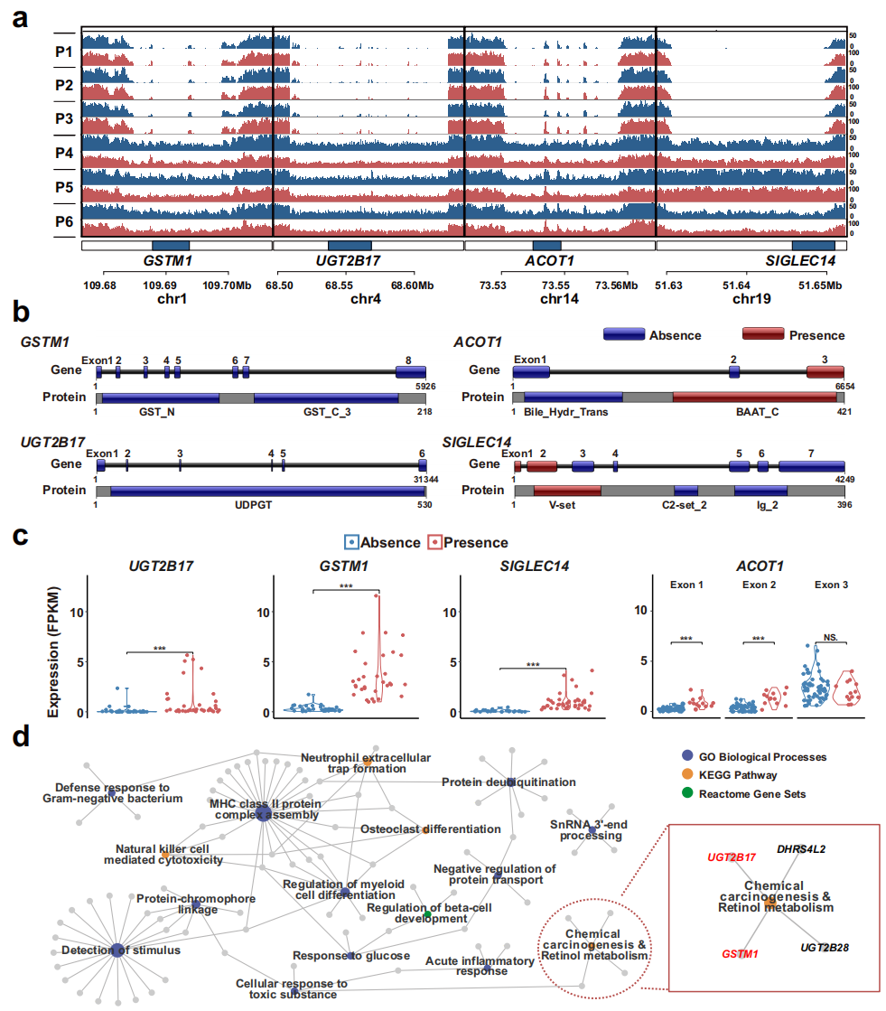 为找出胃癌人群的癌症易感基因,研究团队将上述非必需基因与两个独立的基因组测序数据集(263人来自西蒙斯基因组多样性项目“SGDP”;90人来自中国汉族)进行了比较,并绘制了胃癌人群的PAV图谱(图2)。结果显示,有4个非必需基因(GSTM1、UGT2B17、ACOT1和SIGLEC14)在胃癌人群中高度缺失。UGT2B17在所有亚洲个体中都高频率缺失,GSTM1和SIGLEC14在东亚个体中高频率缺失,ACOT1在中国汉族人群中的缺失频率较高。