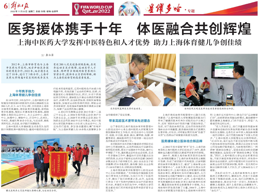 11月22日的《解放日报》第6版刊载报道上海市体育局与上海中医药大学十年来携手同行,精诚合作,在各方面取得亮眼成绩。