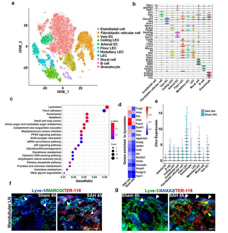 找到核心靶点:对下颌淋巴结进行单细胞 RNA 测序(scRNA-seq)和免疫荧光分析后,团队发现 SAH 后 24 小时,血管外红细胞主要是被下颌下淋巴结髓窦 LEC 中的溶酶体蛋白酶 —— 蛋白酶 S(CTSS)降解。为验证 CTSS 的作用,团队使用 Prox1-creERT2; Ctssflox/flox 小鼠特异性清除淋巴结内皮细胞(LEC)中的 CTSS,或采用抑制剂阻断 CTSS 功能,结果显示两种方式均能显著减轻蛛网膜下腔出血(SAH)后的神经炎症,并有效改善神经功能缺损。