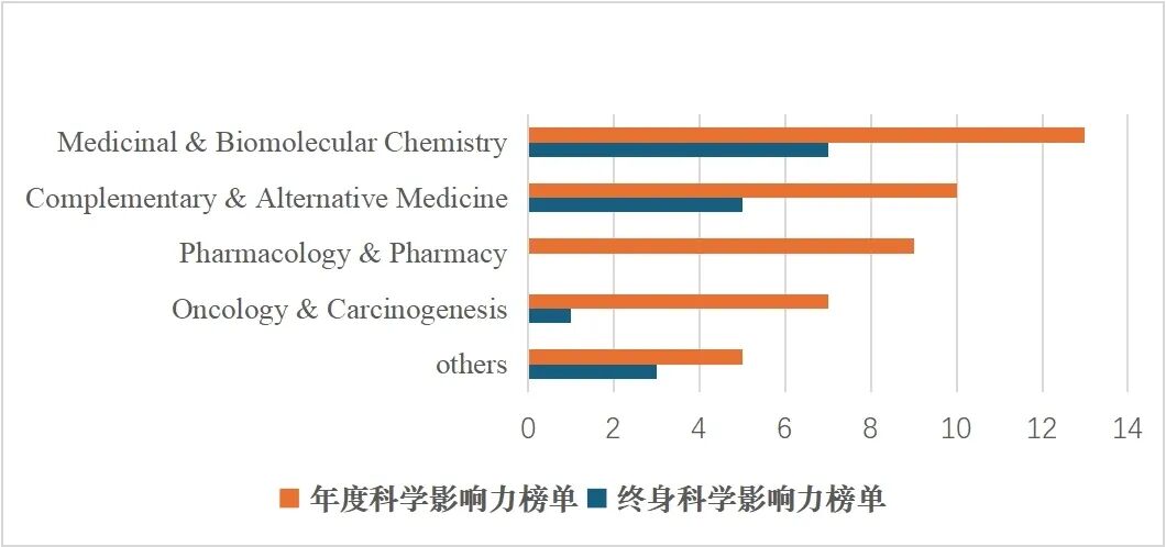 2025年我校共有46位学者入选(较2024年增加13位),包括入选终身科学影响力榜单学者16位(较2024年增加6位)和年度科学影响力榜单学者44位(较2024年增加13位),入选总学者数及单榜单入选学者数均居中医药高校首位。我校入选学者所在学科主要集中在药物与生物分子化学、补充替代医学、药物药理学、肿瘤与癌变四个学科。