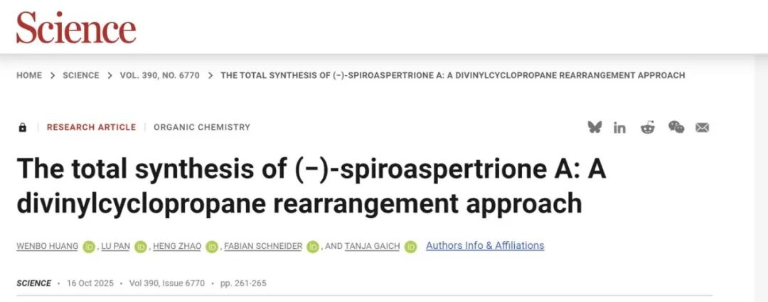 10月16日,国际顶级学术期刊Science在线发表了题为“The total synthesis of (-)-spiroaspertrione A: A divinylcyclopropane rearrangement approach”的研究论文。该研究首次实现了具有显著抗耐药菌活性的中药活性成分(-)-spiroaspertrione A的全化学合成,成为中药合成生物学的突破性成果。我校中药合成生物学研究中心作为第一完成单位,与瑞士弗里堡大学、德国康斯坦茨大学等机构合作共同完成。