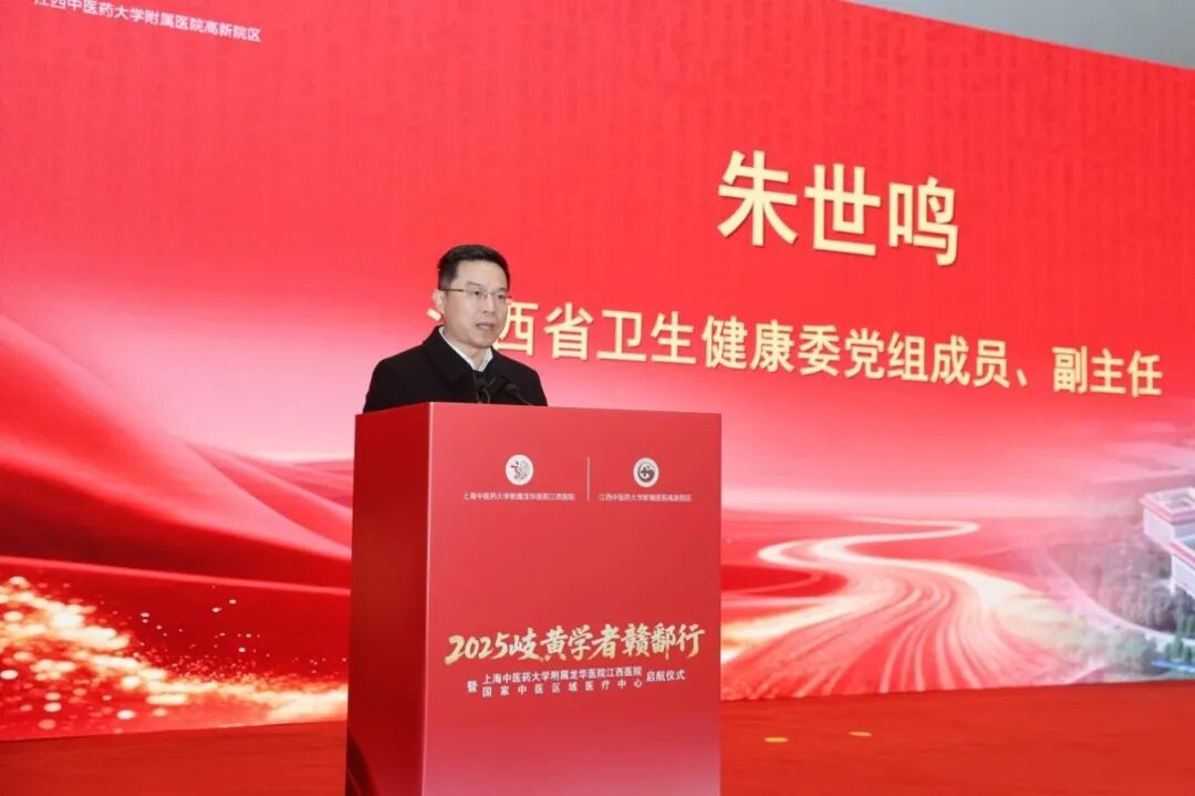 朱世鸣代表江西省卫健委对医院的建成启用表示祝贺,他指出,上海中医药大学附属龙华医院江西医院的启航,是沪赣两地深化中医药合作的重要里程碑,更是落实国家区域医疗中心建设部署的担当使命,让江西百姓在家门口就能享受到国家级优质中医药服务,有效推动优质医疗资源下沉,进一步降低跨省异地就医比例,为江西中医药事业高质量发展注入强劲动力。朱世鸣表示,“2025岐黄学者赣鄱行”活动的同步启动,国医大师、岐黄学者等中医药领域的顶尖专家来到江西,让专家学者们的智慧扎根赣鄱沃土,助力中医药强省建设再上新台阶。