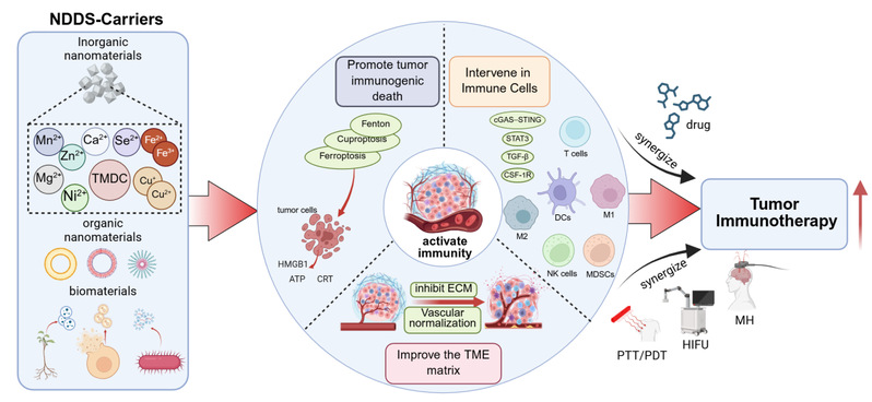 肿瘤严重威胁人类生命健康,尽管免疫治疗近年来取得了突破性进展,但仍面临响应率有限、免疫抑制微环境高度复杂以及实体瘤治疗效果不佳等关键挑战。纳米药物递送系统(Nanodrug Delivery Systems, NDDSs)在肿瘤免疫治疗中具有独特优势,不仅能增强药物靶向性和生物利用度,还能通过多重机制主动参与免疫调控。近年来,随着研究不断深入,越来越多的证据表明NDDS本身即可作为免疫激活的关键驱动因素,参与诱导免疫原性细胞死亡、激活树突状细胞与T细胞、重编程免疫抑制细胞群体,并重塑肿瘤免疫微环境。各类纳米材料平台正经历从药物载体向免疫增强剂的功能转变。这些系统能够在时空维度上协调先天免疫与适应性免疫的协同应答,或通过特异性信号通路直接调控免疫细胞,从而建立持久的免疫记忆。