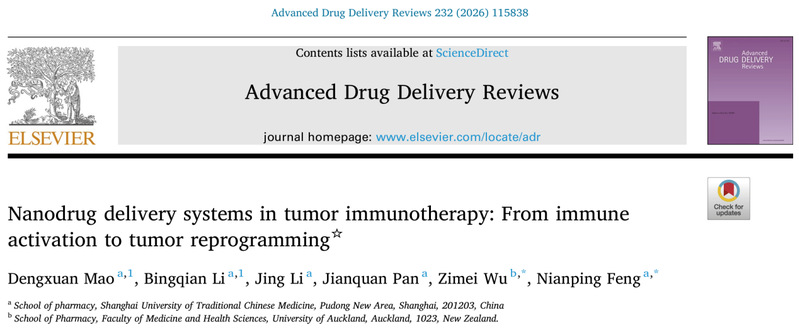 近日,上海中医药大学中药学院冯年平教授团队与新西兰奥克兰大学药学院吴子梅教授团队合作,受邀在国际权威期刊Advanced Drug Delivery Reviews发表题为《Nanodrug Delivery Systems in Tumor Immunotherapy: From Immune Activation to Tumor Reprogramming》的综述论文,系统阐述了纳米药物递送系统在肿瘤免疫治疗中的前沿进展。论文被纳入该刊“Editors Collection 2026”。