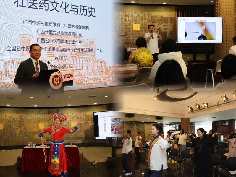 以展览为媒,沪桂两地中医药院校和医疗机构深入开展传统医药学术交流研讨和医疗合作。巡展前夕,广西国际壮医医院与上海市闵行区中西医结合医院开展了深入的交流合作。双方就壮医药特色技法与中西医结合诊疗的融合进行了深入探讨,为沪桂两地医疗合作搭建了专业平台。广西国际壮医医院院长黄国东为上海中医药大学师生带来“壮医药历史与文化”专题讲座,他从壮医药文化的发展载体、发展历程、时代回响三大维度展开,让师生对壮医药的历史底蕴、文化价值与现代发展有了全面且深刻的认识。