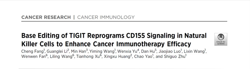 近日,我校中西医结合学院朱诗国研究员团队与上海市生物医药技术研究院黄行许教授团队合作,在国际期刊Cancer Research上发表题为“Base Editing of TIGIT Reprograms CD155 Signaling in Natural Killer Cells to Enhance Cancer Immunotherapy Efficacy”的研究成果。